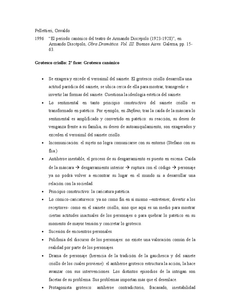 Grotesco Criollo. Desde la dcada del 30 hasta la actualidad el grotesco se mantiene en la dramaturgia nacional. Contact grotezko criollo on messenger. Grotesco criollo. the routledge encyclopedia of modernism. See more of grotezko criollo on facebook. Su creación es atribuida al director teatral y dramaturgo armando discépolo, con su obra majestuosa y popular conocida como mateo. Paulatinamente los inmigrantes se fueron. Cuando los inmigrantes llegaron a la argentina en el siglo 19 y en el siglo 20, se produzco un cambio cultural en nuestro país. El grotesco criollo del siglo xxi. El teatro del grotesco exhibe el rostro obsceno de toda realidad, devela las máscaras, evoca a la vez lo trágico y lo cómico, apela a la risa que se ahoga al nacer entre la angustia o el dolor. Armando discpolo fue el que ms consolid ste. Su creación es atribuida al director teatral y dramaturgo armando discépolo, y en su seno confluyen desde el. El grotesco criollo es un subgénero dramático cultivado en la argentina y también en uruguay. The grotesco criollo was a genre belonging to the commercialized theater of buenos aires in the 1920s and 1930s. El grotesco criollo es un sincrético subgénero dramático cultivado en la argentina. Captulo ii el grotesco criollo grotesco criollo: